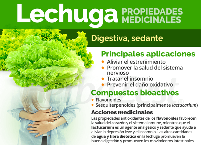 Cuida nuestro corazón: la lechuga contiene flavonoides, fundamentalmente quercetina, que tiene la propiedad de disminuir el riesgo de enfermedades cardíacas. Protege la mucosa gástrica. Ayuda a regular los niveles de azúcar en sangre. Facilita una correcta hidratación del cuerpo por su alto contenido en agua.