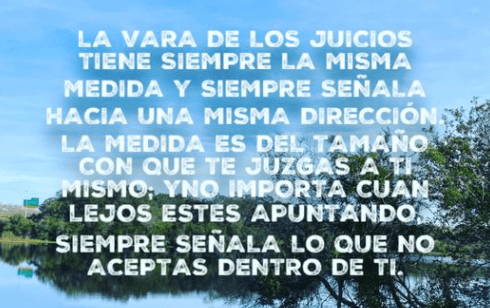 El que te juzga es porque se juzga a si mismo. Todo se trata de cada uno. Solo nos conocemos en nuestro trato hacia los otros . Si estás hecho de chocolate no puedes entregar fresas. Cada uno da lo que lleva dentro. La vara la sostienes tú , solo tú puedes decidir disminuir tus propios juicios hacia ti y así disminuir la medida de tu propio dolor llenándote de paz, comprensión y amor hacia ti mismo . De lo que estés lleno es lo que saldrá de ti.