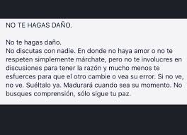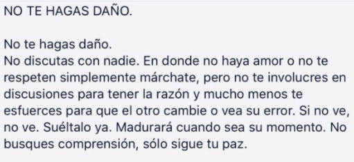 No te hagas daño. No discutas con nadie. En donde no haya amor o no te respeten simplemente márchate, pero no te involucres en discusiones para tener la razón y mucho menos te esfuerces para que el otro cambie o vea su error. Si no ve, no ve. Suéltalo ya. Madurará cuando sea su momento. No busques comprensión, sólo sigue tu paz. No te hagas daño. No pases horas, días, semanas y meses mirando películas, televisión o navegando por Internet. La tecnología es la droga de los tiempos modernos.