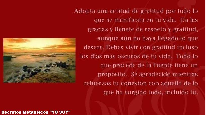 Adopta una actitud de agradecimiento por todo lo que se manifieste en tu vida. Vive con gratitud en todo momento, incluso en los días mas oscuros de tu vida. Recuerda que todas las experiencias son para aprender.